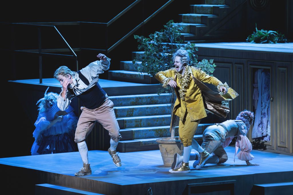 Dernæst vælter en beruset mand ind på scenen, vaklende som en skibbruden med en flaske champagne i hånden. Lidt opkast flyver ud over kanten, inden han falder om på toppen af trapperne. Efterhånden erfarer vi, at manden er grev Almaviva, der er hjemvendt fra endnu en af sine mange byture. Denne gang er han alene – men det ville bestemt ikke være første gang, hvis han havde taget en ‘ven’ med hjem, selvom han altså har en kone.