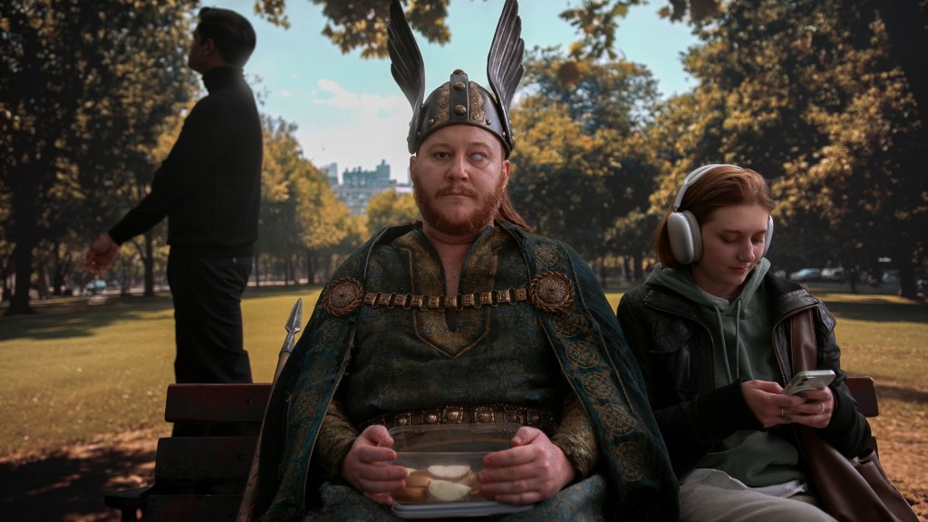 Kratzer’s interpretation of Das Rheingold is a production that blends multiple worlds. In the last two Ring cycles I’ve seen, I’ve missed some of the original artifacts, such as Wotan’s spear, the tarnhelm, Donner’s hammer, and the ring itself. All of this and more is present here. The costumes have a flair for ancient Norse vibes; Wotan struts around in a cloak, a horned helmet, and brandishing a spear – a look that screams “all-powerful god!” But hold onto your helmets, because when he heads down to Nibelheim, he has to trade his divine ensemble for a rather dull blue suit, leaving his godly glamour behind.