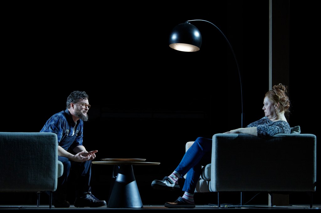 The dryer couple’s room is (as so often) filled with washing machines, while on the other side of the wall, there’s a dining table, a kitchen, a grey sofa, and a tall bunk bed that looks like it was borrowed from one of Berlin’s more budget-friendly hostels—speaking from experience here… Yet, when the visitors arrive, he’s asked to sleep on the sofa—just the beginning of a relationship that leads to a (brilliantly staged) couples therapy session at the start of Act 3 and unfortunately (spoiler alert!) ends with a divorce by the end. His desire to have a child isn’t quite reciprocated by his wife—even though she watches videos from fertility clinics and cell samples…
