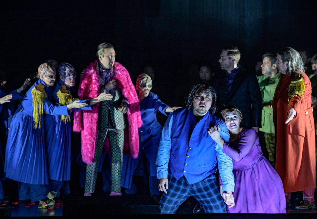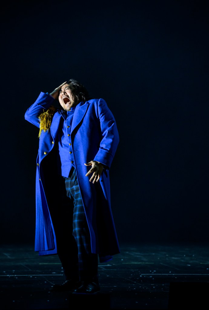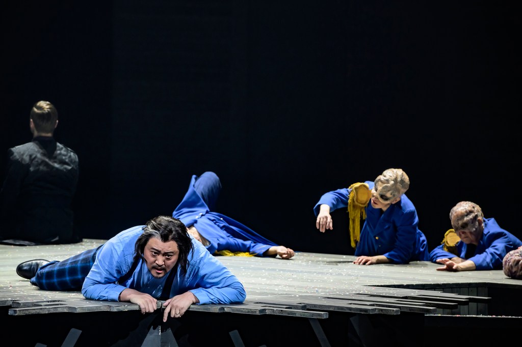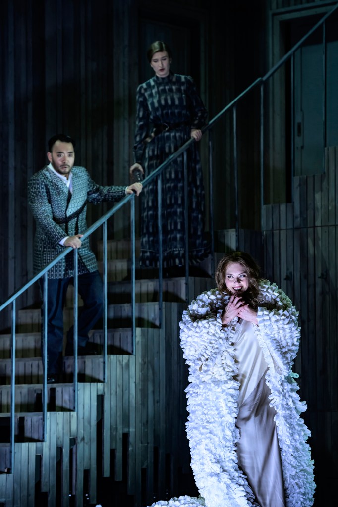 The cast for the evening is all well-known around the house. South Korean baritone Sangmin Lee handles the role of Macbeth very well, and it’s easy to follow his voice throughout the performance. American Emily Newton, playing Lady Macbeth, doesn’t shy away from the role, though her vibrato can sometimes tip into the over-the-top territory (but that’s also just a question about taste). Still, her articulation keeps things sharp, letting us in on her character’s scheming manipulation and madness.
