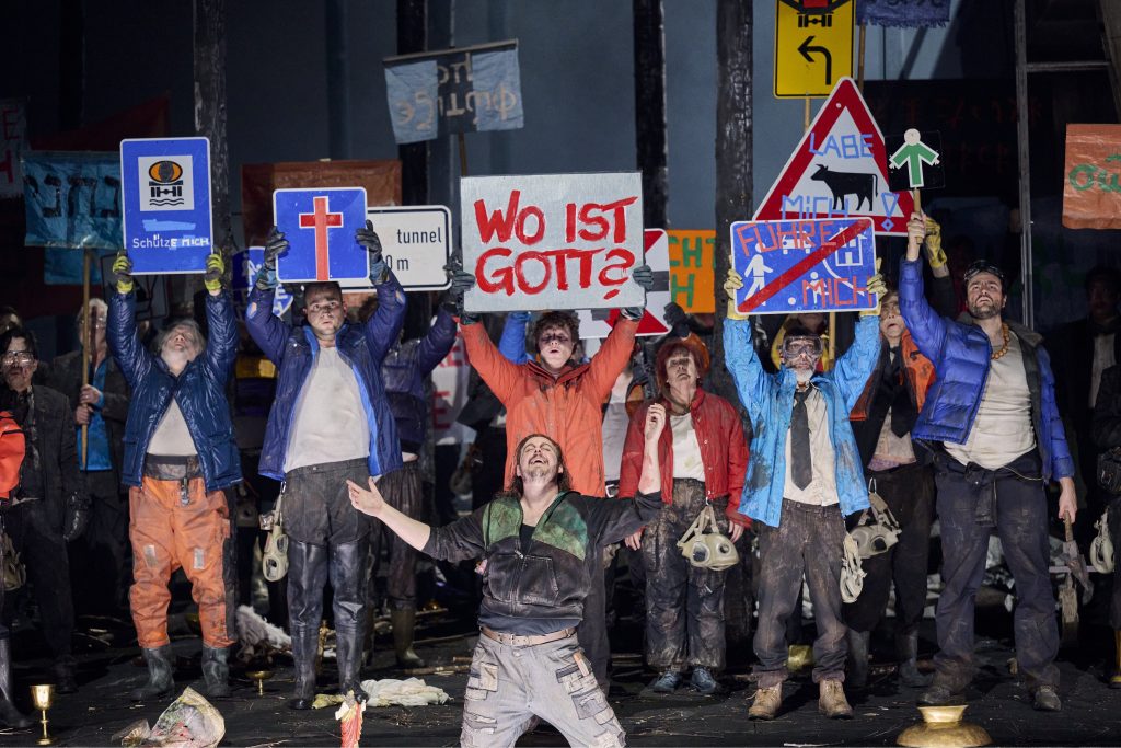 The world’s a mess. Under a crumbling concrete bridge, the knights of the grail have gathered—dusty, dirty, and dressed like they raided the nearest thrift store blindfolded. Nothing matches. Nothing makes sense. Except for old Gurnemanz, the pious priest who still clings to some sort of dignity. He seems oddly composed—until he isn’t. Turns out he’s got some inner demons too… which he lets out by literally whipping a child to death. Welcome to Parsifal, folks.