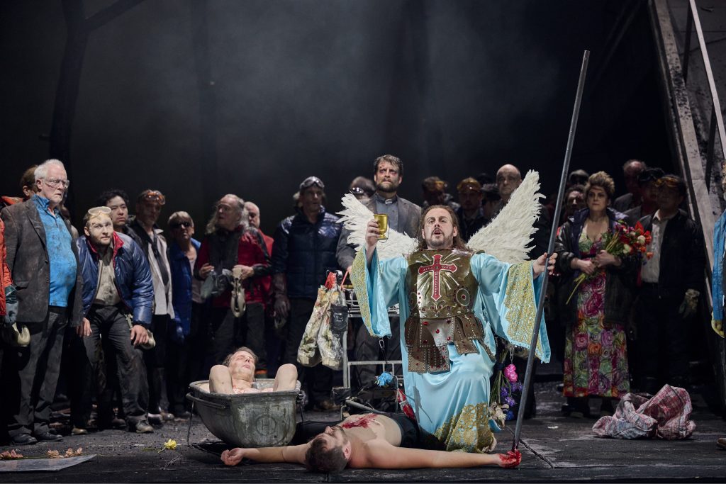 There’s no swan-shooting here, which is usually how Parsifal is introduced; instead, they bicker over the dead angel boy Gurnemanz whipped to death. And when Amfortas shows up, the others go (even more) wild—like sled dogs on espresso.