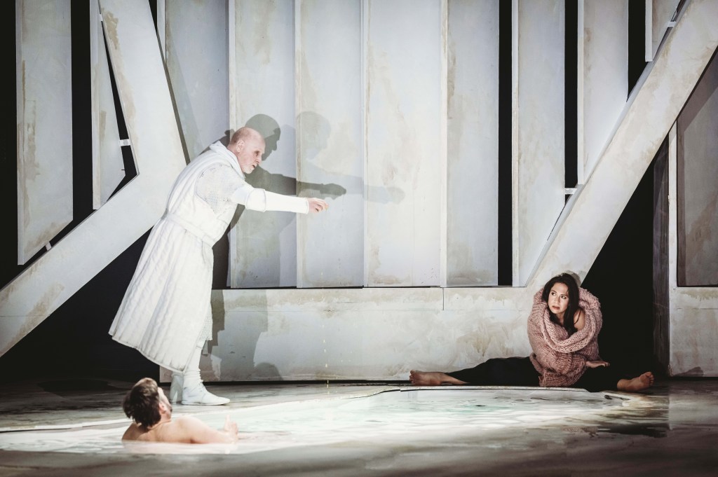 And then crashes Kundry. Not exactly the shy, silent type — she storms in, shoves the poor guy from the opening scene straight into the shallow pool at center stage, and stands there like she owns the place. Except she clearly doesn’t. While everyone else is draped in sterile whites, she’s in a bubblegum-pink puff-sleeve top that screams outsider. The knights recoil when she approaches, taking careful steps back as if she might bite.