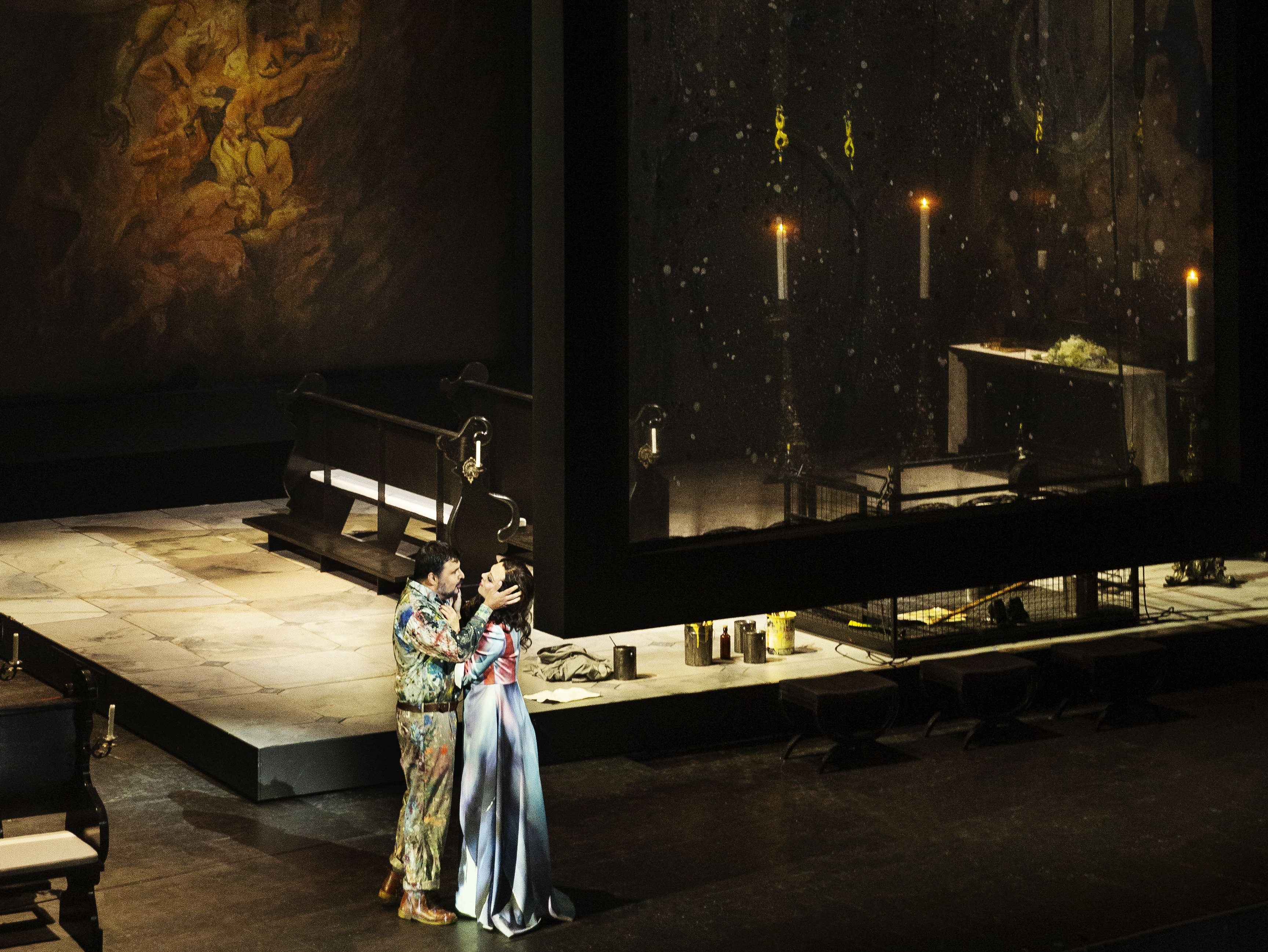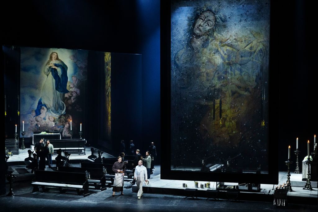 And where do we land? In a church. But not just any church. This is Sant’Andrea della Valle in Rome – holy, hefty, and highly specific. Unlike so many operas that keep things vague. Here we’ve got a concrete setting. And that’s exactly where Danish director Kasper Holten (also the CEO of the house) places us in Act One. Or at least in something that looks like a Catholic church.