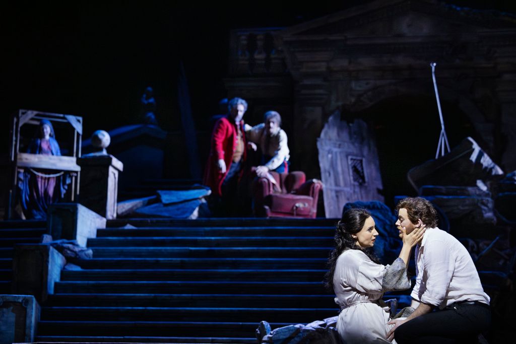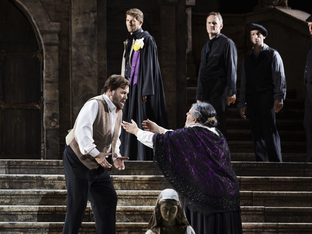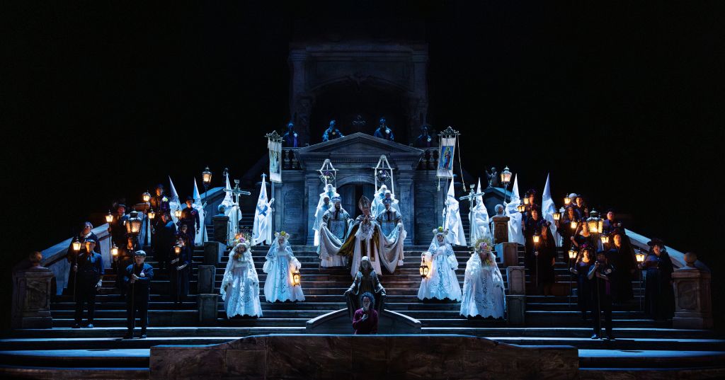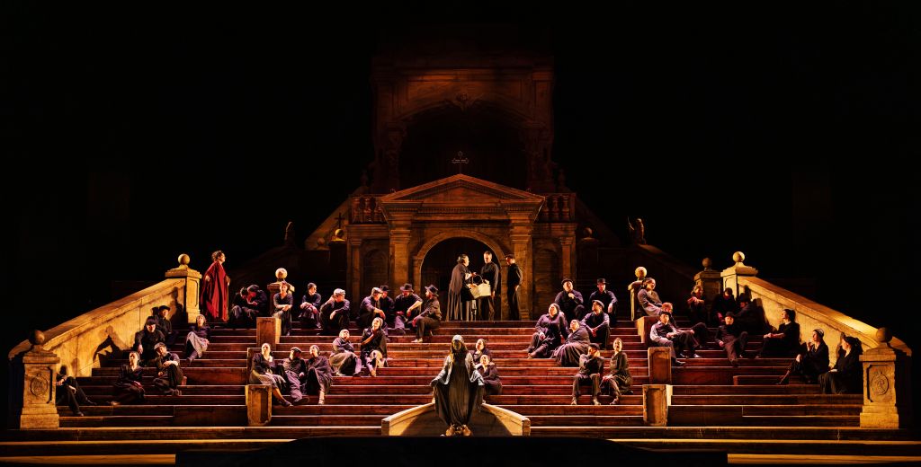Kasper Holten, who’s directing, gives us a skyhigh staircase. “La scala,” we could call it. It stretches up, up, up, and at the very top? A church.