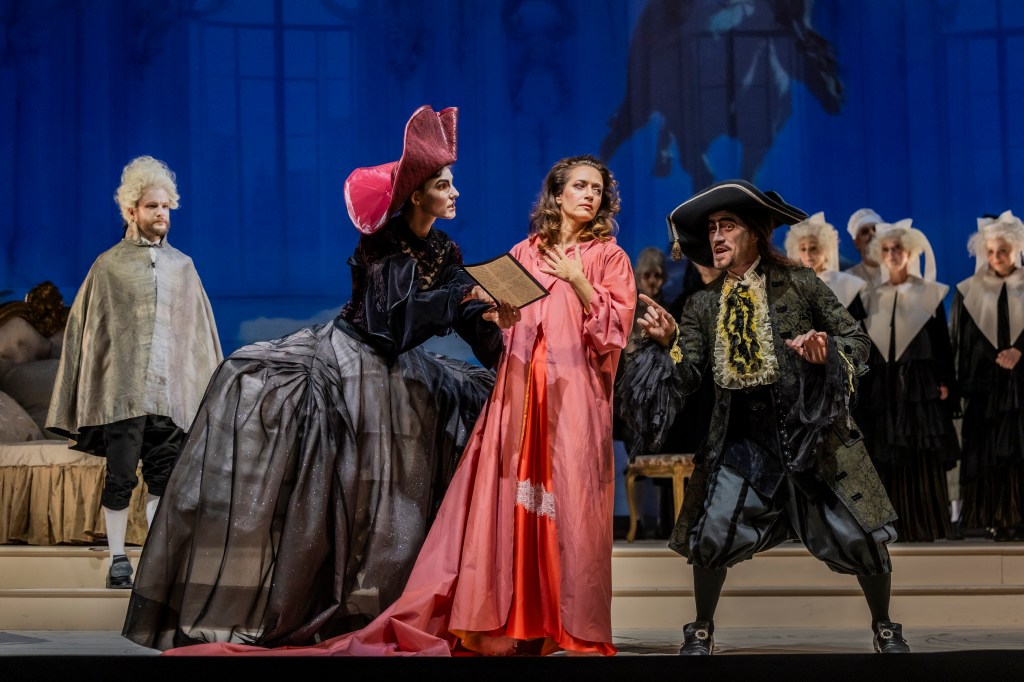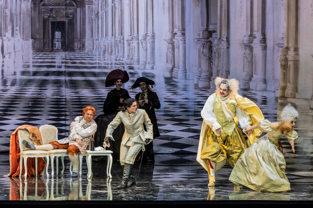 The set is sparse and two-dimensional. Kind of reminds me of Alvis Hermanis’ Tosca production at the Staatsoper in Berlin… But the visuals are striking enough to give the impression that we’re in a bedroom, in a lavish house with black-and-white checkered marble floors, and in an amusement park…? A giant glowing Ferris wheel, a horse with glowing red eyes that doesn’t look very friendly, and an equally unfriendly clown creature, also with red eyes. Are we still in the 18th century?