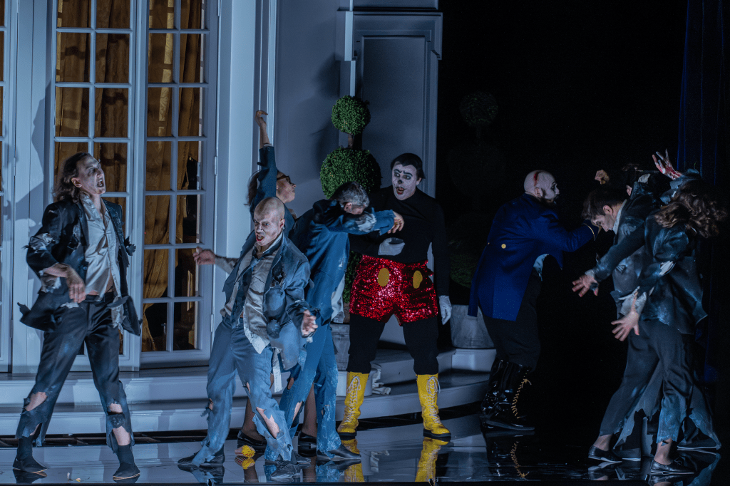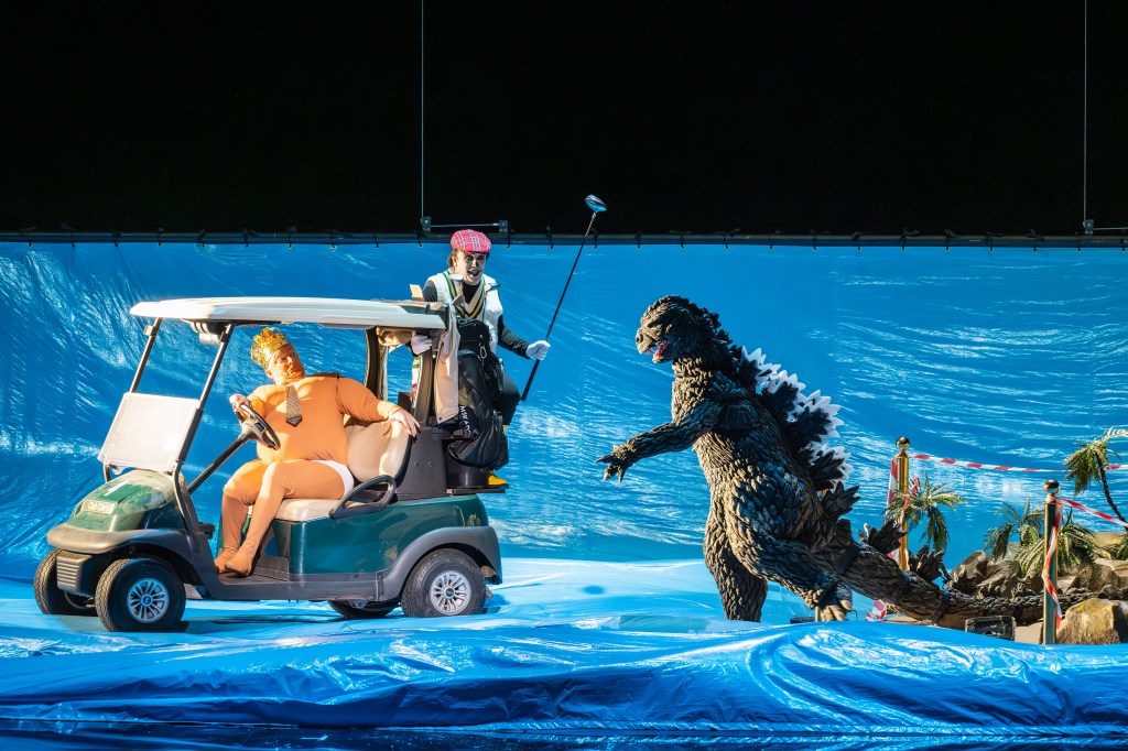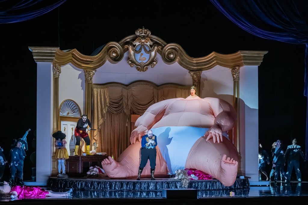 The president’s servants – henchmen, lackeys, call them what you like – go by the names Mickey and Tuckey, both sung by countertenors. Mickey? As in Mickey Mouse? Ding ding diiing. And they are far from the only recognisable faces. Disney princesses greet the audience in the foyer, dressed in short skirts and waving pom-poms: Sleeping Beauty, Cinderella, Belle, Snow White. Elvis drops by. So do characters from The Muppet Show, Maria from The Sound of Music, and two walking hotdogs. And that’s really just the beginning…