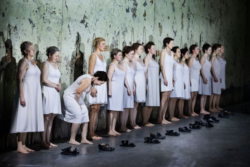 After each slice of the guillotine, a pair of shoes is hurled back through the hole – slammed against the opposite wall, then left to fall. Sixteen times. The pile of shoes keeps growing. Pair by pair. While the stage is gradually stripped of people, of voices, of life in the air, almost bare.